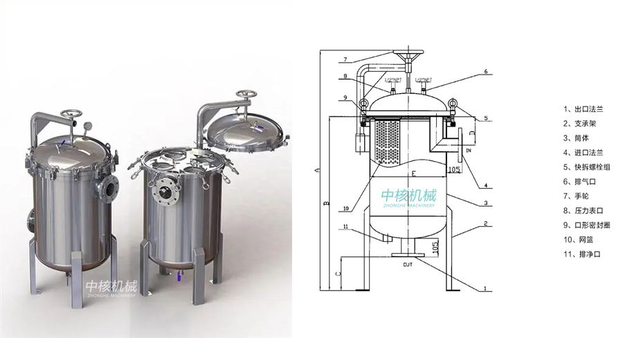 袋式過濾器是一種結構新穎、體積小、操作簡便靈活、節(jié)能、密閉工作的多用途過濾設備。袋式過濾器是一種壓力式過濾裝置,主要由過濾筒體、過濾筒蓋、快開機構、不銹鋼濾籃等部件組成。過濾機內部由金屬網(wǎng)籃支撐濾袋,液體由過濾器外殼的旁側入口流進濾袋,經(jīng)濾袋過濾后從出口流出,雜質被攔截在濾袋中。該機更換濾袋十分方便,過濾基本無物料消耗。